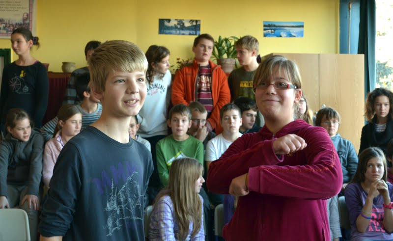 Másnap reggel ők is iskolába jöttek velünk. Minden órán más-más játékkal ismerkedhettek meg, ezekre a foglalkozásokra mi is elkísértük őket. Volt néptánc óra, gyöngyfűzés, és bemutattak nekik  magyar népi hangszereket is. Szünetekben társasjátékoztunk és fociztunk velük. Játszottunk  a nemrég kapott interaktív tábláinkon is.